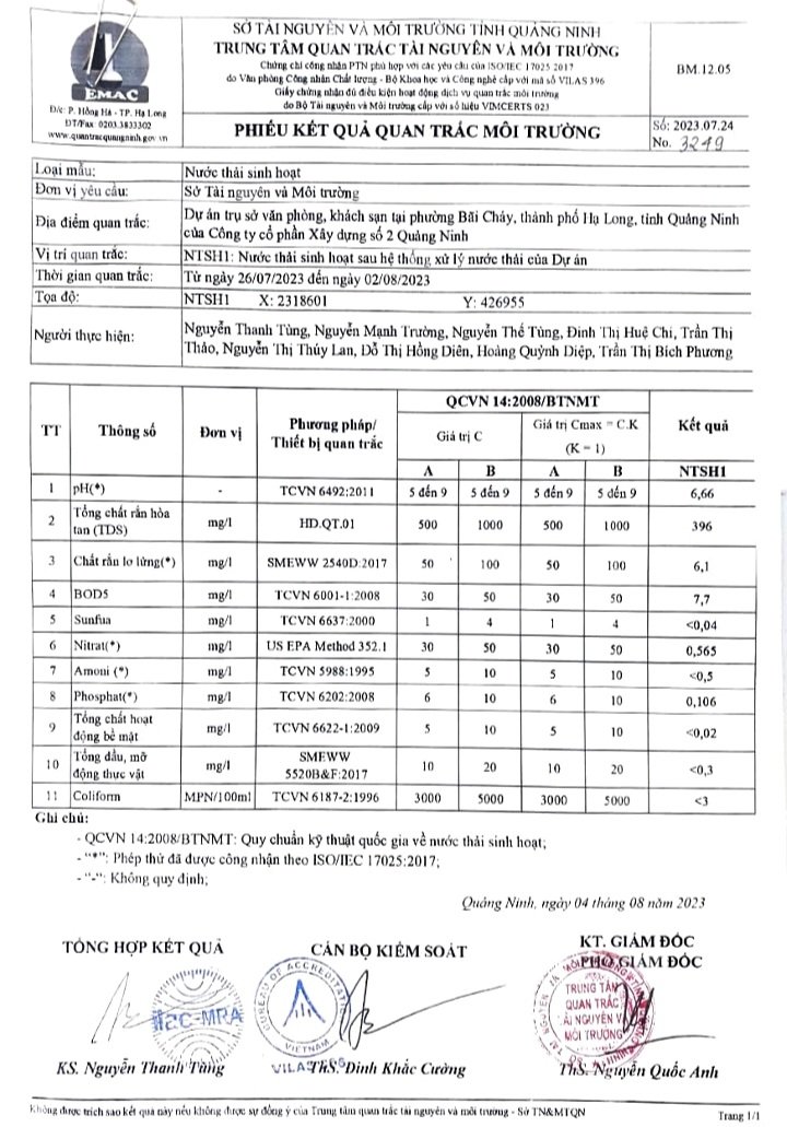 PHIẾU KẾT QUẢ QUAN TRẮC MÔI TRƯỜNG